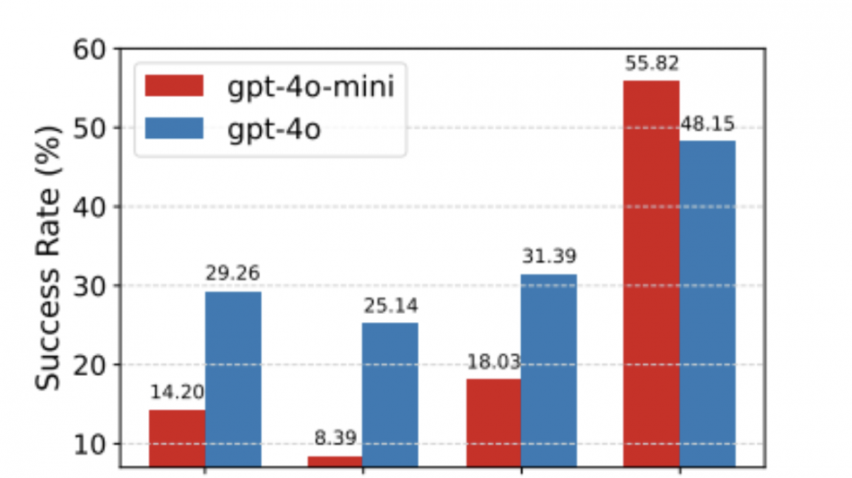 Comparing the success rates of four methods (CoT, Two-agent, Reflexion, Matrix) across GPT-4o-mini and GPT-4o, with Matrix achieving the highest performance.
